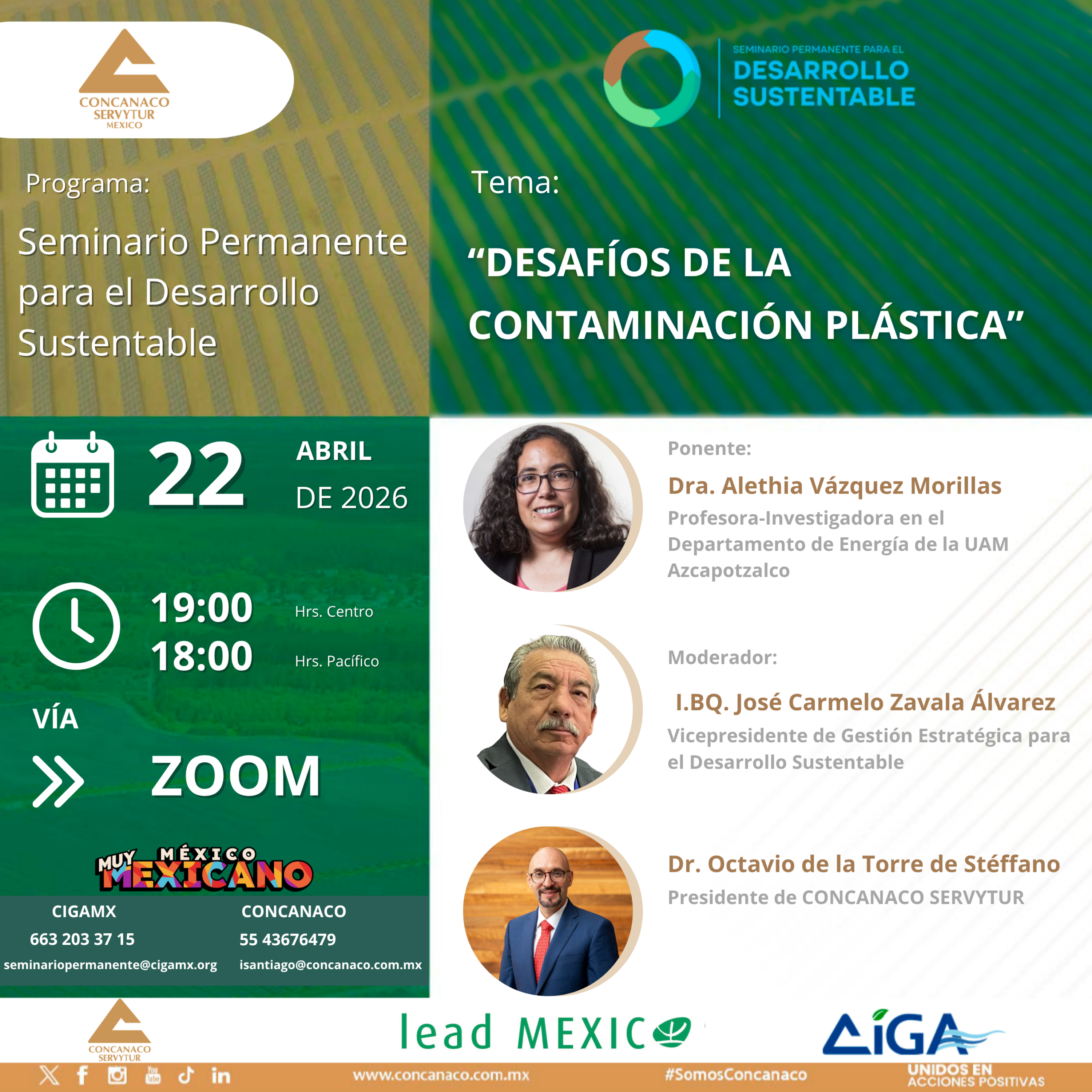 El Centro de Innovación y Gestión Ambiental México A.C. (CIGAMX), en colaboración con la CONCANACO SERVYTUR y el Programa LEAD México te invitan a participar en una nueva edición del Seminario Permanente para el Desarrollo Sustentable, un espacio de diálogo y aprendizaje sobre los retos socioambientales que enfrenta nuestro país.