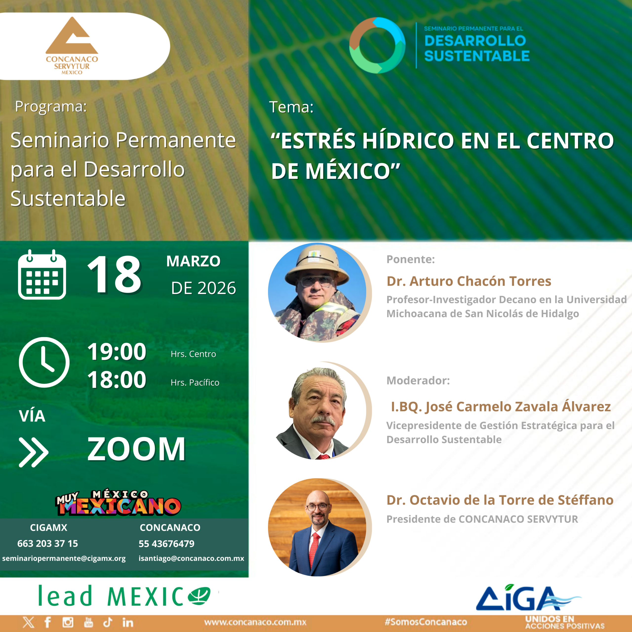 El Centro de Innovación y Gestión Ambiental México A.C. (CIGAMX), en colaboración con la CONCANACO SERVYTUR y el Programa LEAD México te invitan a participar en una nueva edición del Seminario Permanente para el Desarrollo Sustentable, un espacio de diálogo y aprendizaje sobre los retos socioambientales que enfrenta nuestro país.