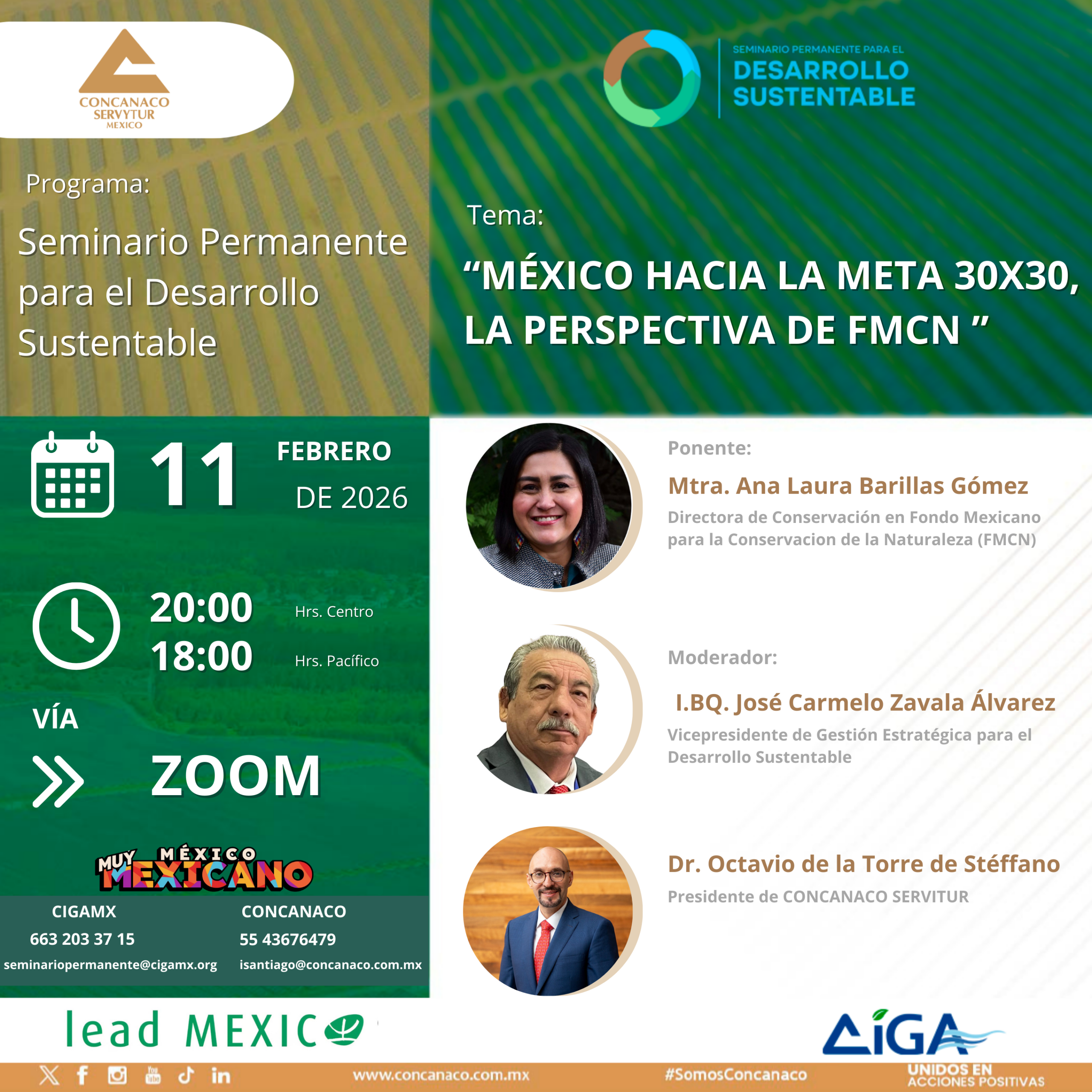 El Centro de Innovación y Gestión Ambiental México A.C. (CIGAMX), en colaboración con la CONCANACO SERVYTUR y el Programa LEAD México te invitan a participar en una nueva edición del Seminario Permanente para el Desarrollo Sustentable, un espacio de diálogo y aprendizaje sobre los retos socioambientales que enfrenta nuestro país.