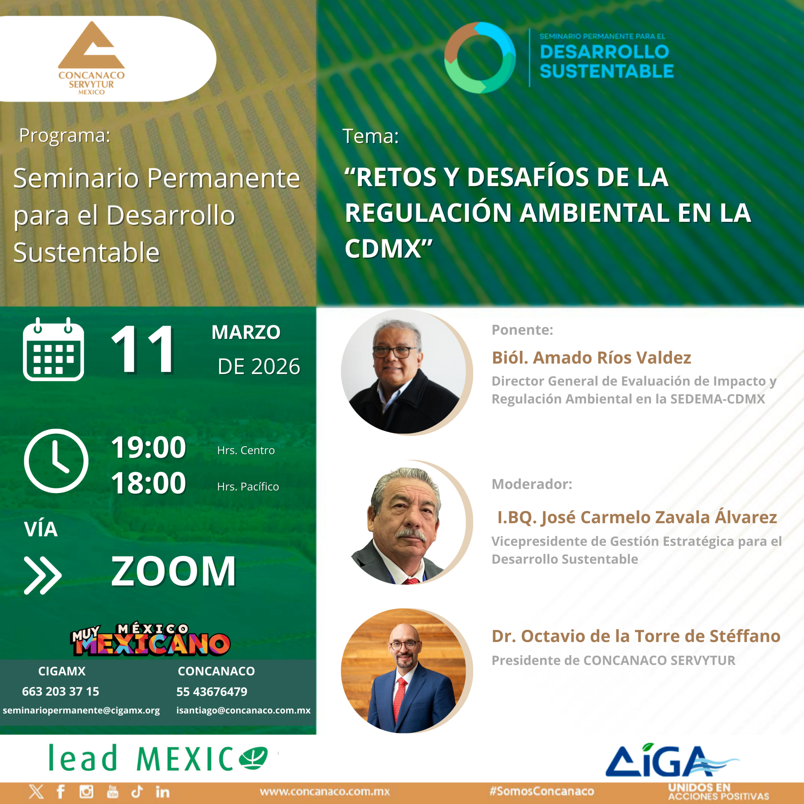 El Centro de Innovación y Gestión Ambiental México A.C. (CIGAMX), en colaboración con la CONCANACO SERVYTUR y el Programa LEAD México te invitan a participar en una nueva edición del Seminario Permanente para el Desarrollo Sustentable, un espacio de diálogo y aprendizaje sobre los retos socioambientales que enfrenta nuestro país.