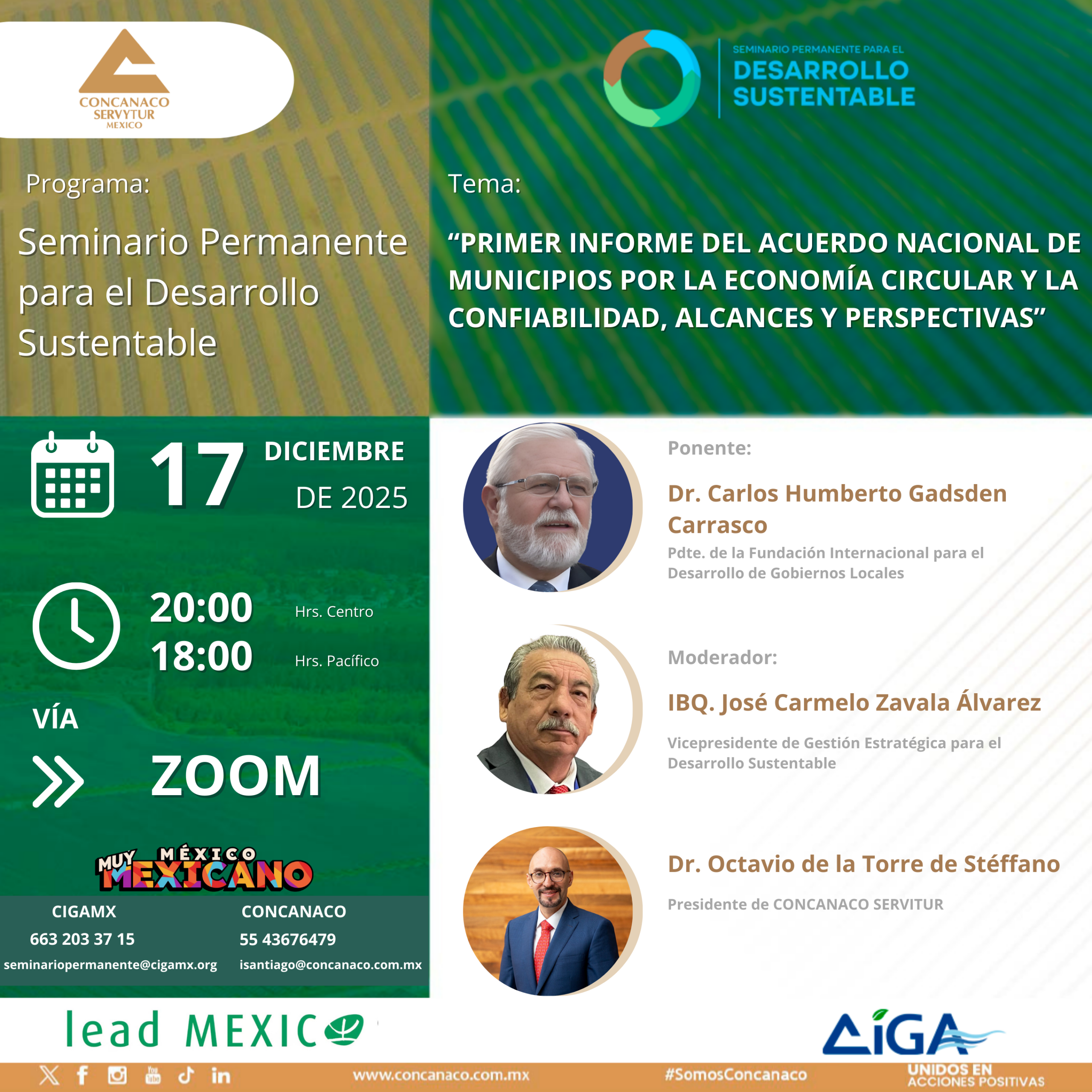 Seminario Permanente para el Desarrollo Sustentable El Centro de Innovación y Gestión Ambiental México A.C. (CIGAMX), en colaboración con la CONCANACO SERVYTURy el Programa LEAD México te invitan a participar en […]
